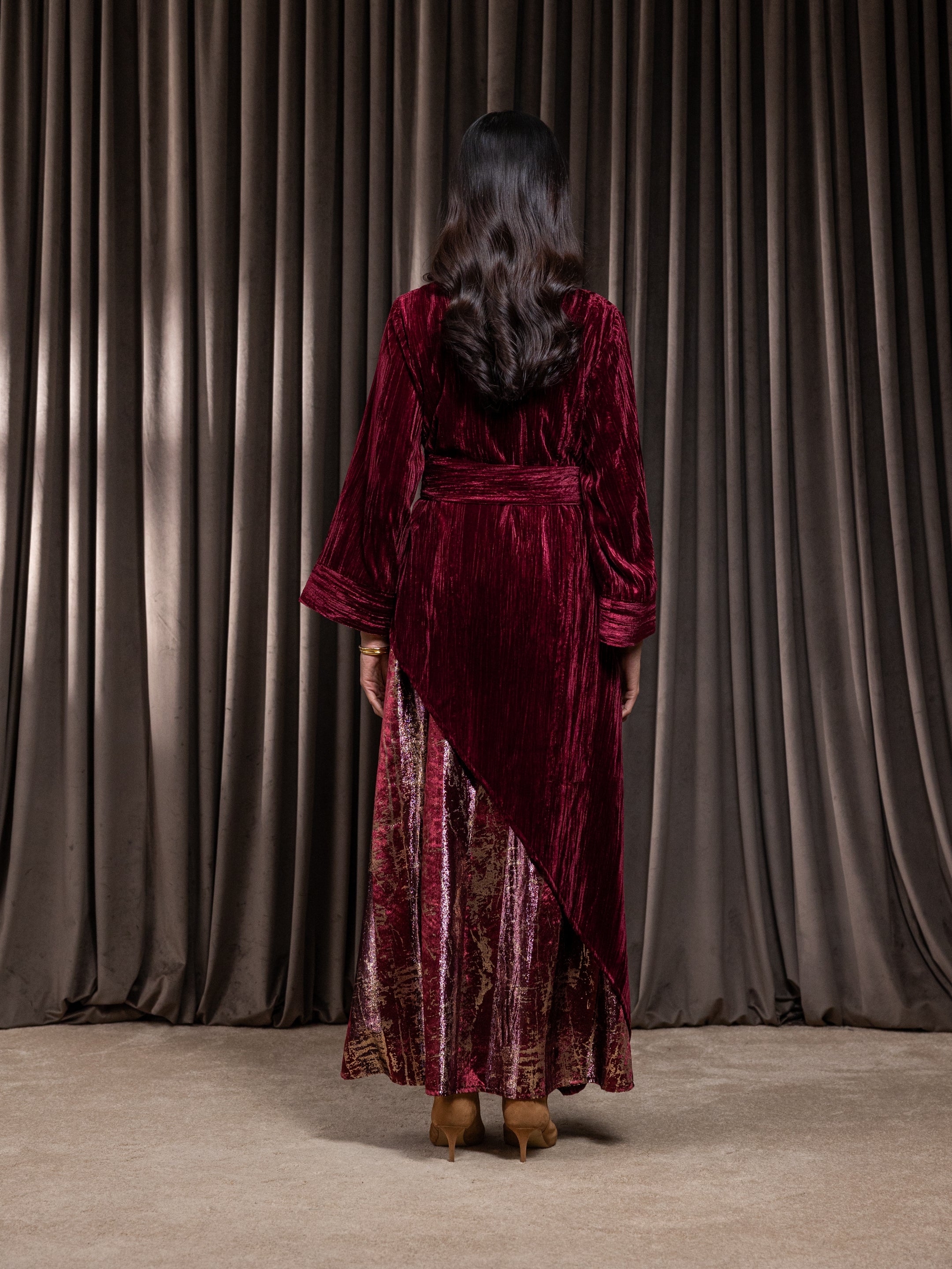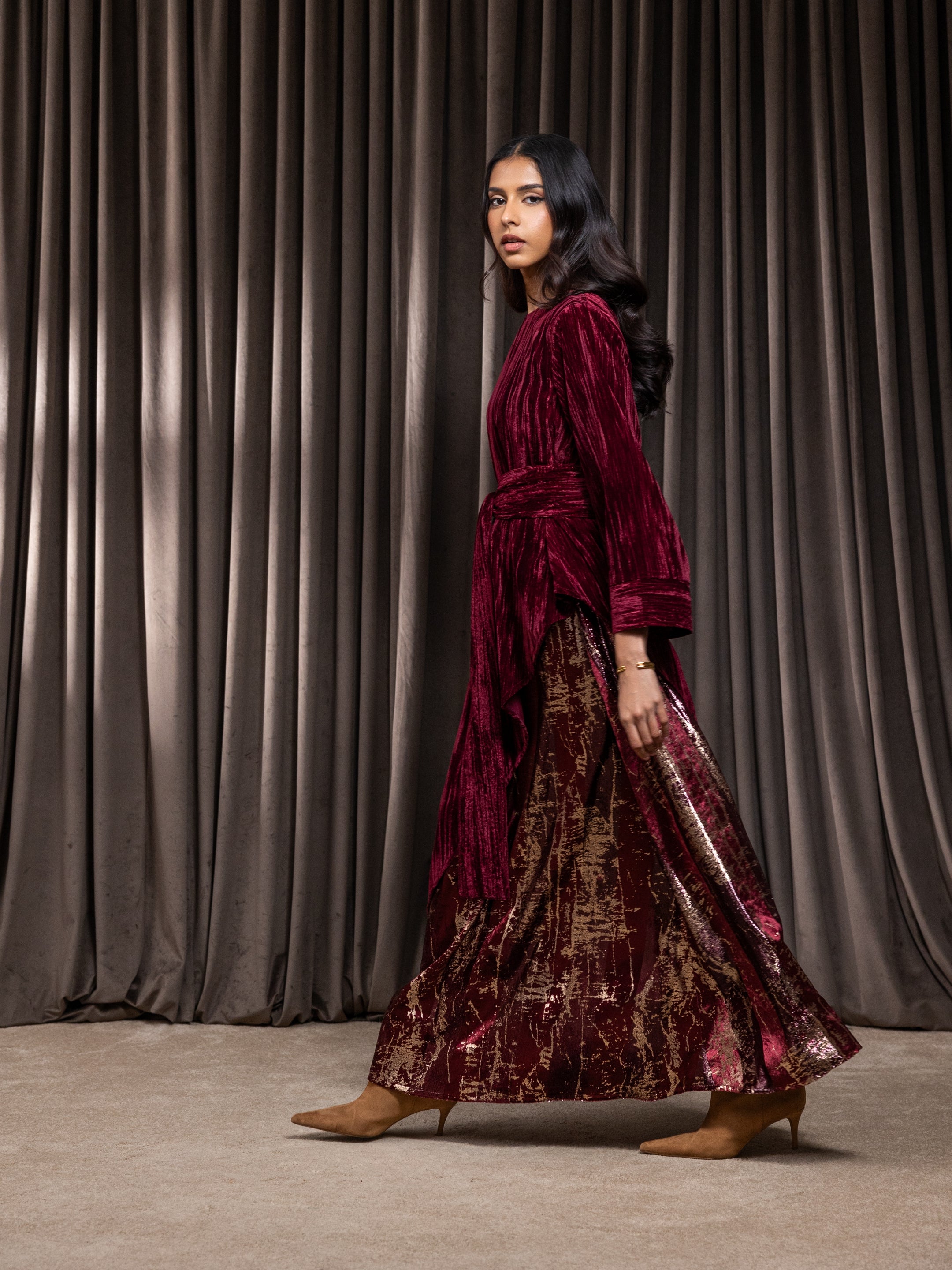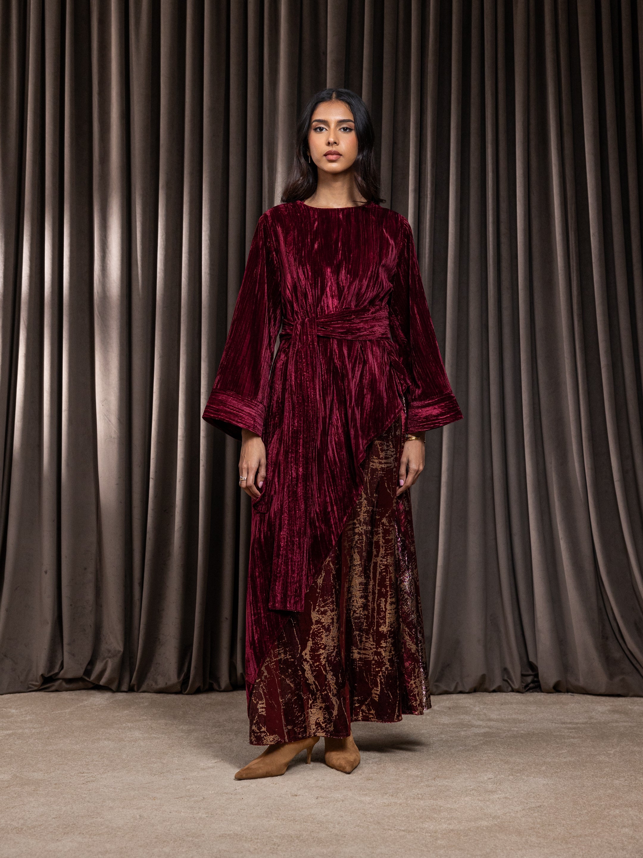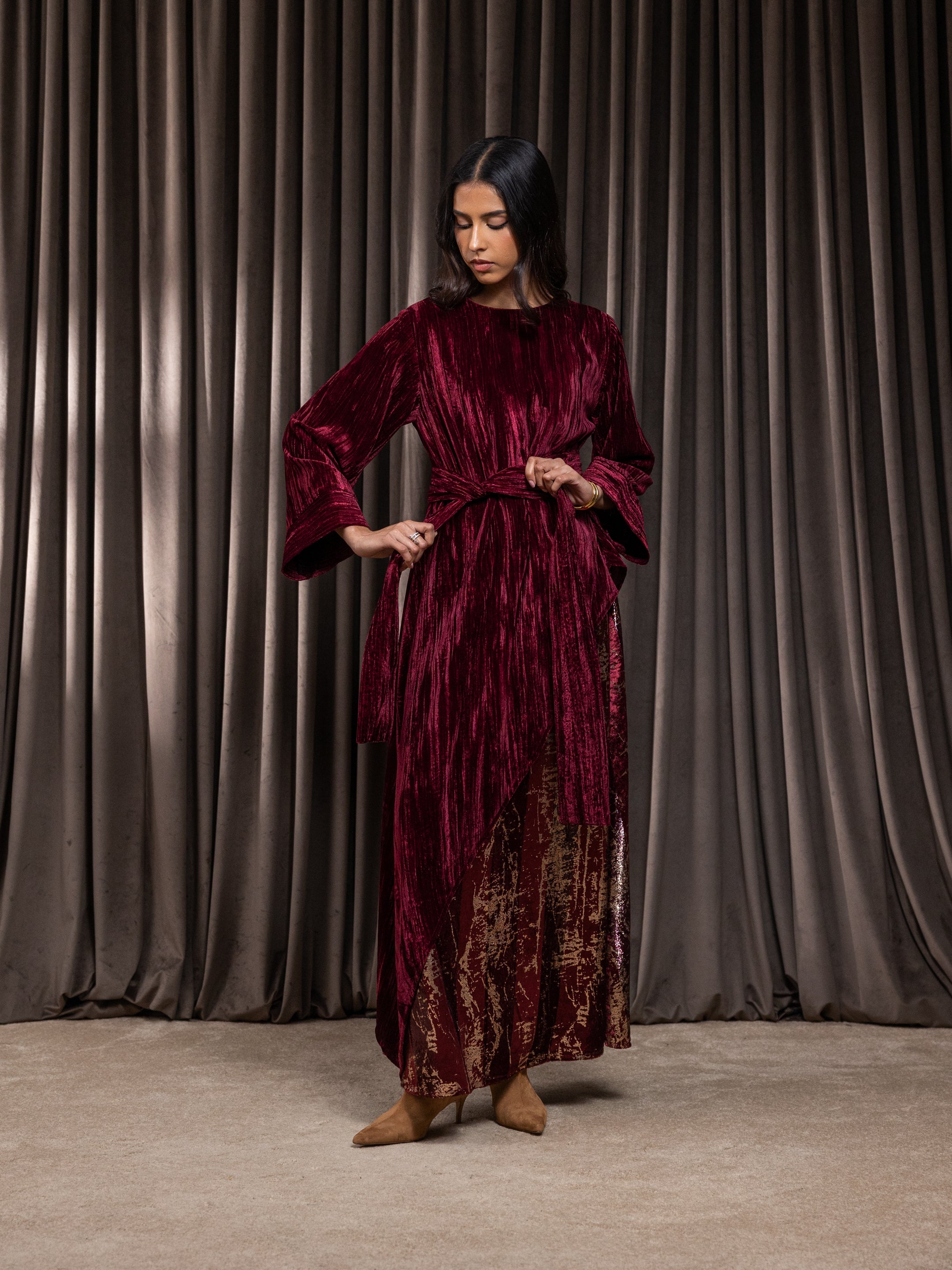 Elegant two-piece velvet midi dress with a flowing silhouette and long sleeves, complete with a belt.
