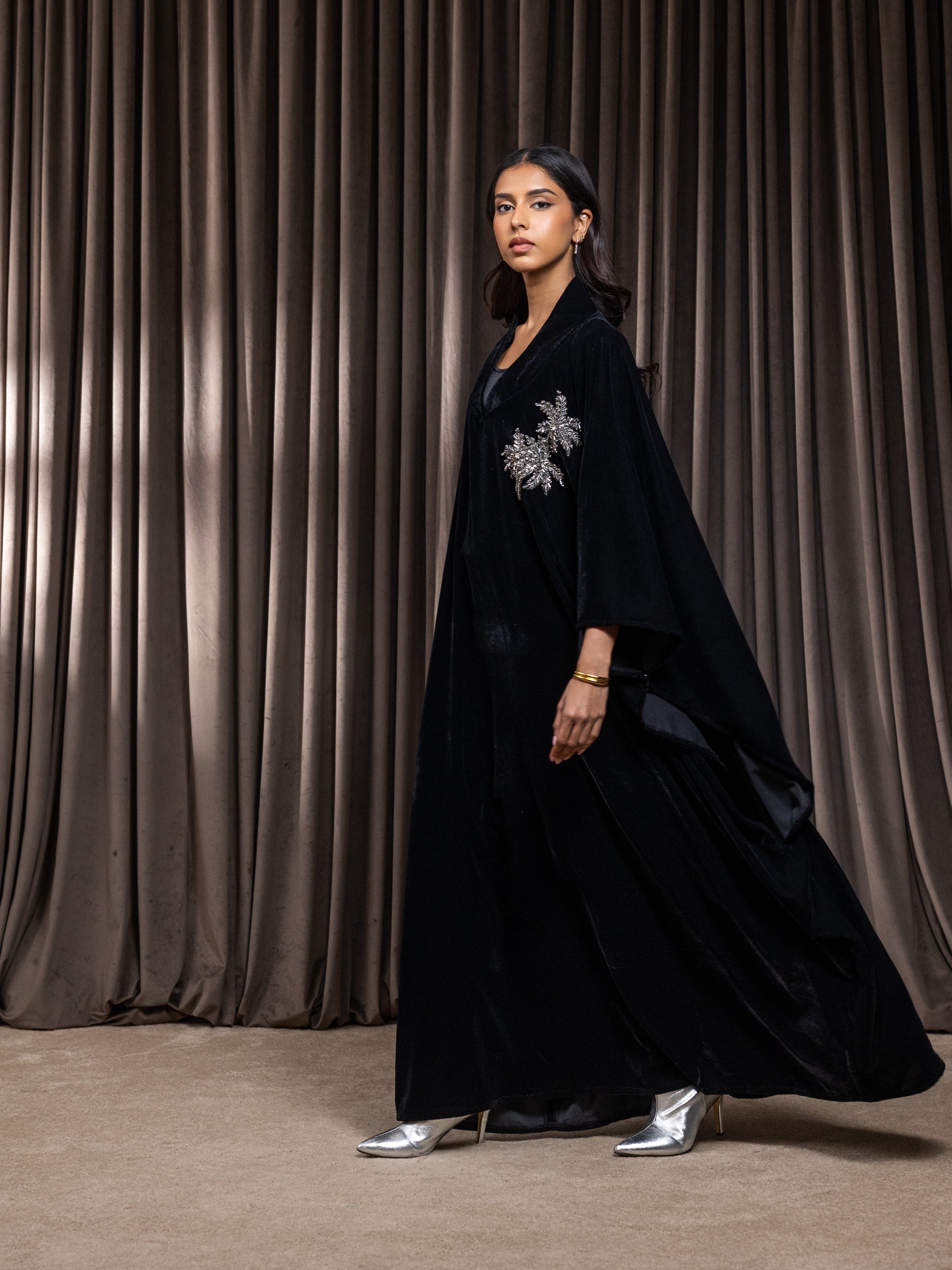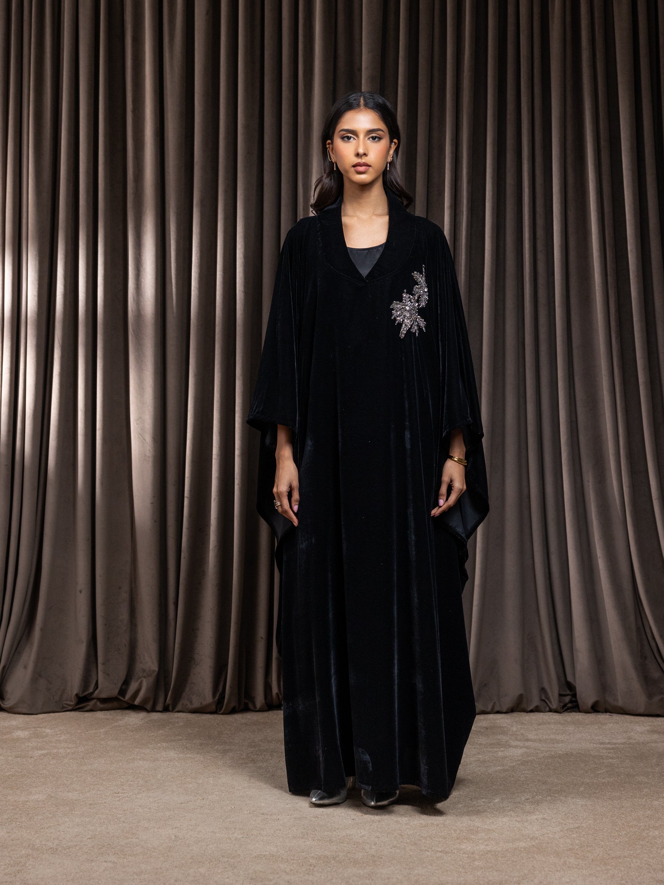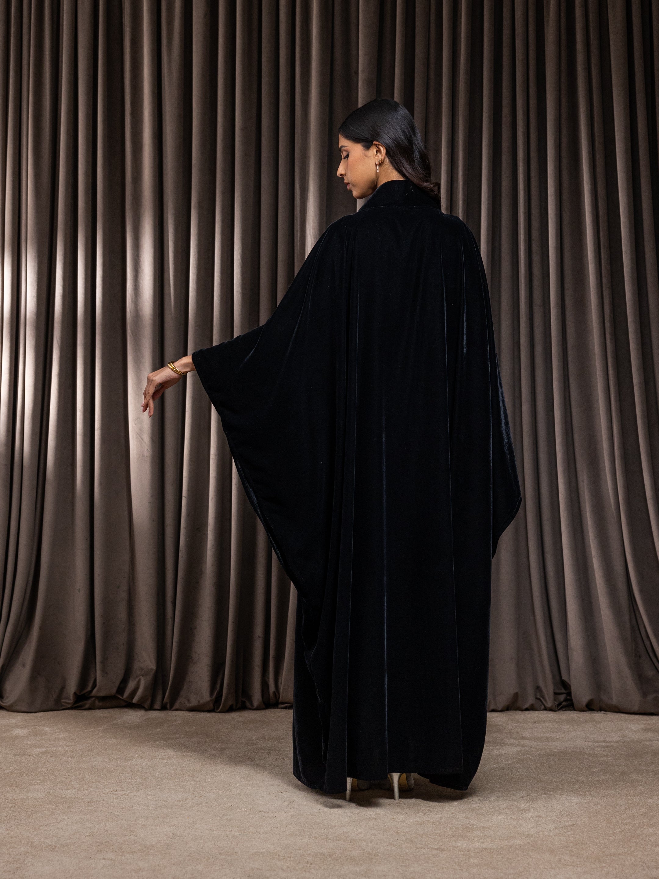 Black velvet dress crafted with an internal adjustable belt, allowing you to cinch and control the fit from the inside for a more defined and flattering shape while keeping the outer look seamless and elegant.